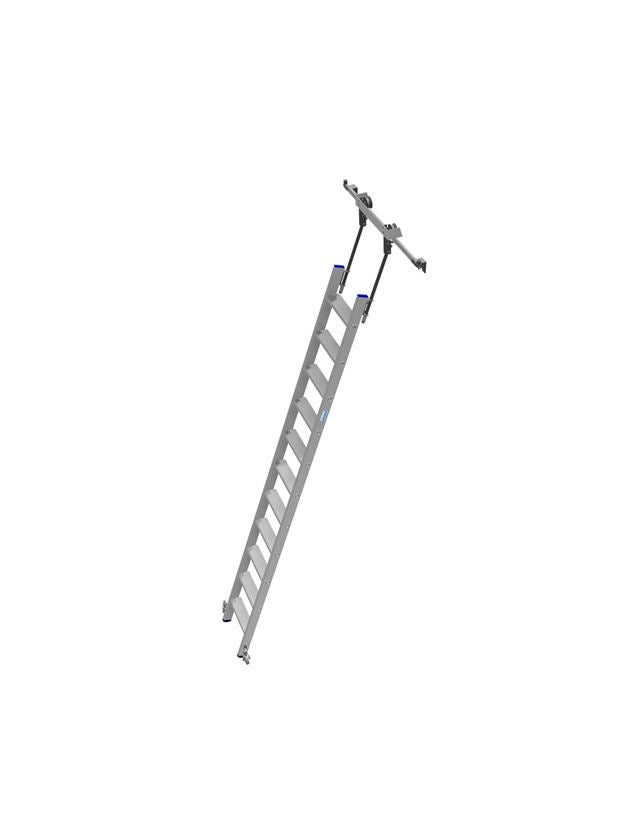 Stabile, verbördelte Alu-Stufen-Regal-Leiter (für Rundrohr-Schienenanlage) mit montiertem Kopffahrwerk. Profilierte, 80 mm tiefe Alu-Stufen für sicheren Aufstieg und bequemen Stand. Am unteren Leiterende 2 selbstarretierende Bremsrollen (Ø, 80 mm). Zwei Laufwerke am oberen Ende mit Bremse und gleitgelagerten Rollen. Leiter senkrecht am Regal abstellbar. Leiterneigung 21°.