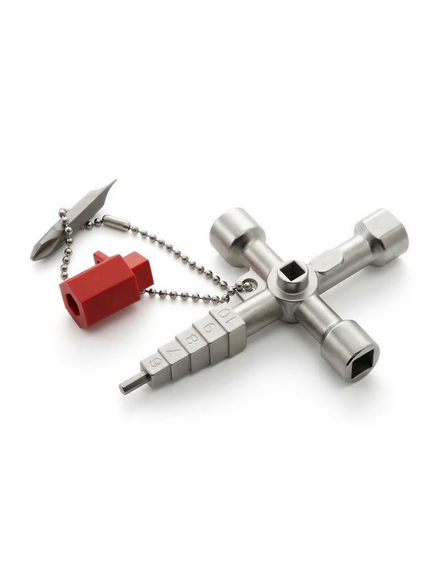 Für die Bereiche Heizungs- (zur Heizungsentlüftung), Klima-, Sanitär und Gebäudetechnik sowie für Tür- und Fenstergriffe. Ausgestattet mit Vierkant (5 / 7/ 8 mm), Dreikant (10 mm), konischer Vierkantdorn (4-10 mm) sowie ein Adapter und Bit-Einsatz (Schlitz 1,0 x 7 / Kreuz PH2) an einer Kette befestigt.