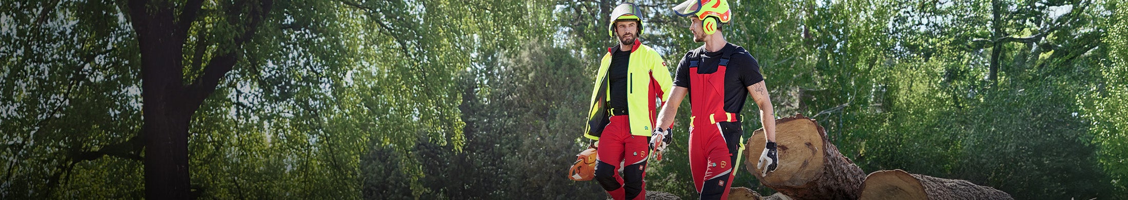 Hlavní náhled, Lesnictví, SADA: e.s. Les. protipoř. kalh. do pasu KWF+přilba, červená/výstražná žlutá