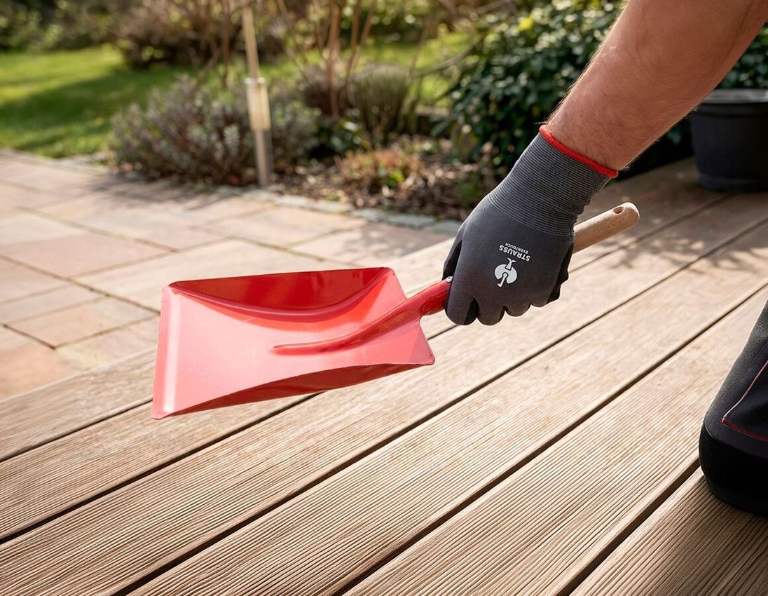 Plechový, červeně lakovaný. S dřevěnou rukojetí a závěsným kroužkem.