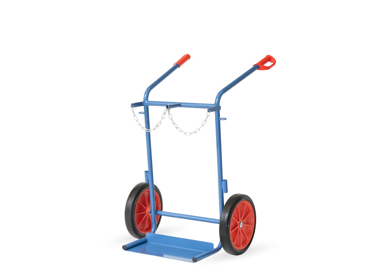 Stahlflaschenkarre für 2 Flaschen mit 40-50 Liter Inhalt, Flaschen-Ø 204-229 mm. Absolut fester Halt der Stahlflaschen mit dreiseitiger Umrandung und leicht einhängbarer Sicherungskette. Stabile Schweißkonstruktion mit Sicherheitsgriffen. Pulverbeschichtet in blau.