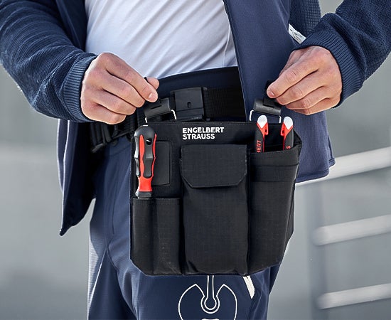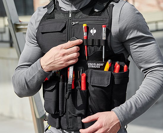 Einfache Kleidungsstücke wie zum Beispiel Gürtel, Weste oder Short werden mit e.s.tool concept zum smarten Werkzeug-Ablagesystem. Profitieren Sie davon, Ihre wichtigsten Helfer immer griffbereit zu haben und so flexibel wie nie zuvor an einem Ort zu vereinen.