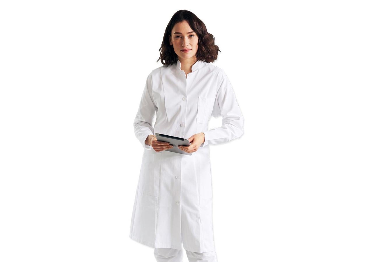 Z modną stójką i atrakcyjnymi szwami działowymi z przodu. Dwie naszyte kieszenie boczne, jedna kieszeń na piersi z naszytą przegródką na długopisy. Z wcięciem z tyłu. Długość w przypadku rozmiaru 38: ok. 100 cm.